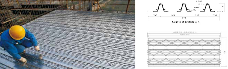 采用1.0mm厚鍍鋅鋼板,經(jīng)過沖孔、凸臺工藝成型:施工階段承載濕混凝土,作為施工模板。